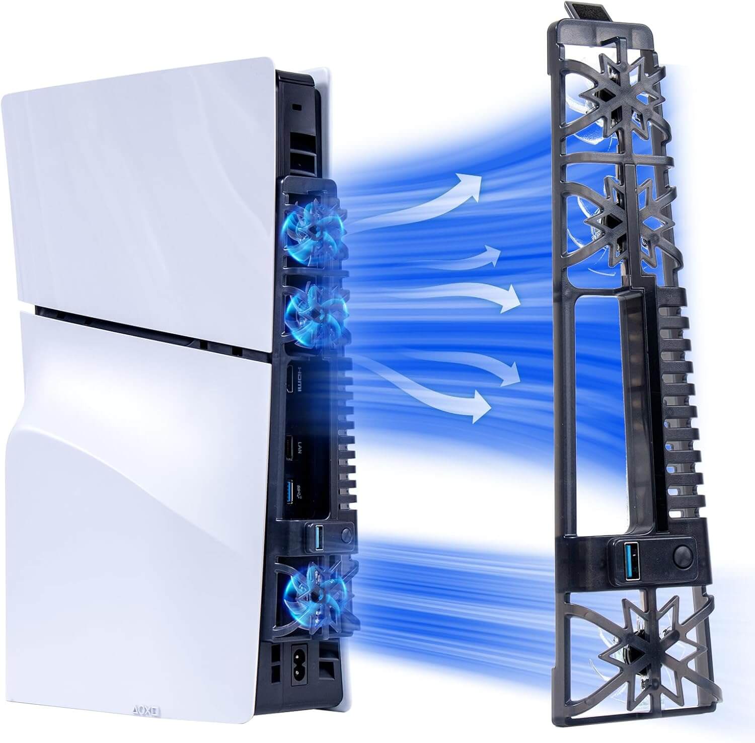 Three Fan Gears - The PS5 Slim cooling fan offers three different fan gears for you to choose from. The first gear provides a normal wind and blue light, the second gear delivers strong winds and illusory ambient lighting, and the third gear allows you to turn off the fan and ambient light as needed.